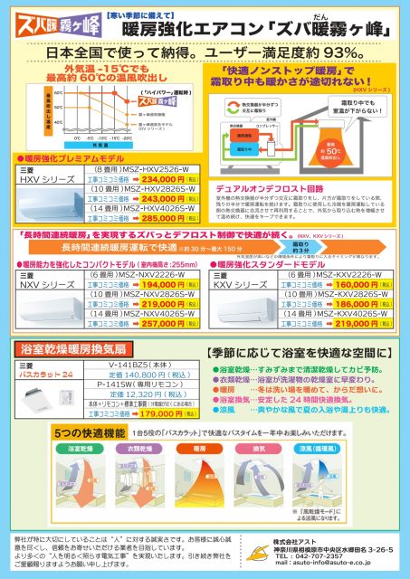 また、ユーザー満足度93%の三菱電機「ズバ暖」各シリーズもお得な工事コミコミ価格でご提供いたします。